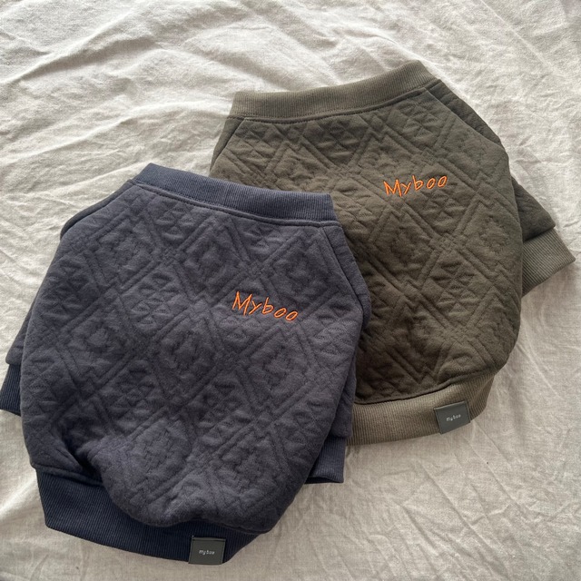 ■ QUILT SWEAT - ORTEGA - cotton 100%(Batting:polyester 100%) ついつい店主が手に取ってしまうオルテガ柄! そんなオルテガ柄のキルトスウェットが登場!! お世話になっている生地屋さんも 上質な生地&好きすぎて 販売をためらい倉庫にしまっていたという とっておきの生地をMy boo流に仕立てました キルト生地ですが厚すぎず とっても柔らかな手触りです♡ ポイントには胸元のガゼットと 脇のリバースウィーブで古着風に♡ 一足先に着用していた我が家も この冬ヘビロテで着用している 店主オススメのアイテムです♩ 着丈・袖丈は短く変更可能◎ 首元のゴムも変更可能ですので 多少大きい or 小さい子も調整可能です 普段のラグランタイプのお洋服より 少しゆとりを持った型紙に 修正してお作りしてます 伸縮性 ★★★☆☆ ※ 推奨サイズ XS:N:32cm, C:49cm, L:29cm(~7.5kg) S:N:36cm, C:53cm, L:31cm(8~9.5kg) M:N:38cm, C:57cm, L:32cm(10~12kg) L:N:42cm, C:60cm, L:33cm(12.5~13.5kg) XL:N:45cm, C:65cm, L:35cm(14~15.5kg) ■ model GHIBLI(クリーム) S着用(N:37cm, C:57cm, L:31cm, 9.2kg)